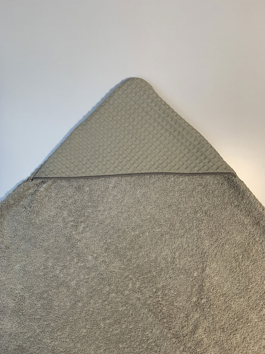 Een heerlijke omkeerbare badcape gemaakt van een licht grijze wafelstof en een licht grijze badstof. Te gebruiken na een badje en voor de koude dagen.