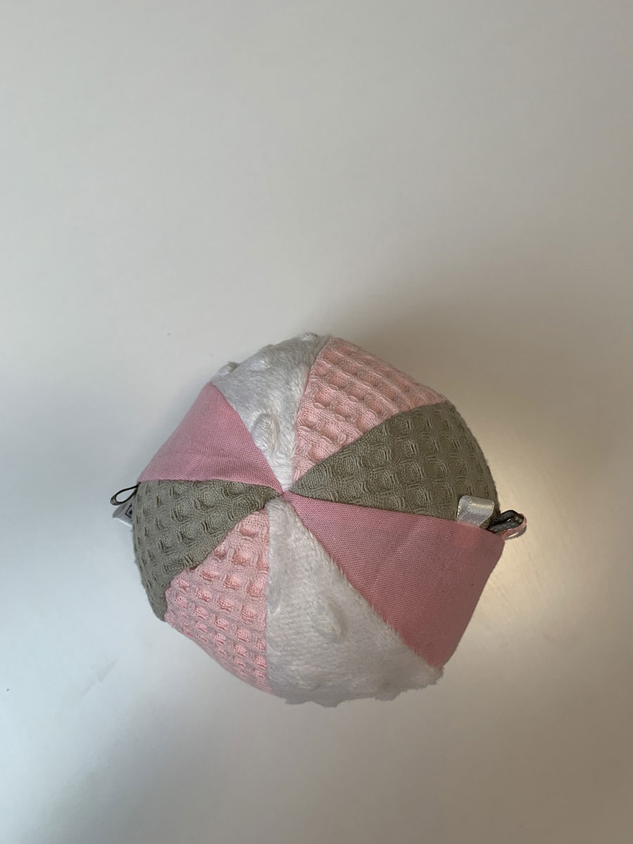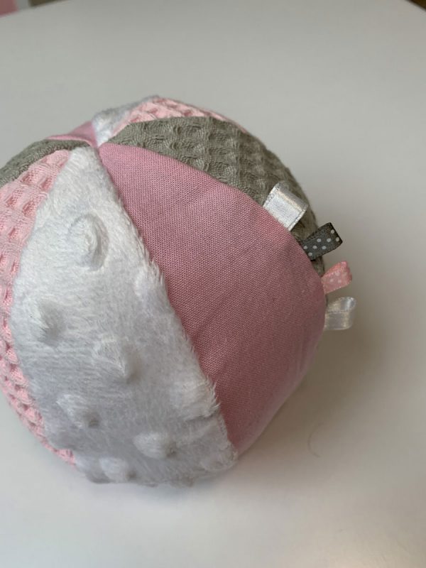 Een leuke bal in de kleuren licht grijs, licht roze en wit om mee te spelen. Deze bal is gemaakt van verschillende soorten stoffen waaronder minkey fleece met een vulling van losse fiberfill. Hierdoor is hij lekker zacht voor de baby en gemakkelijk te wassen.