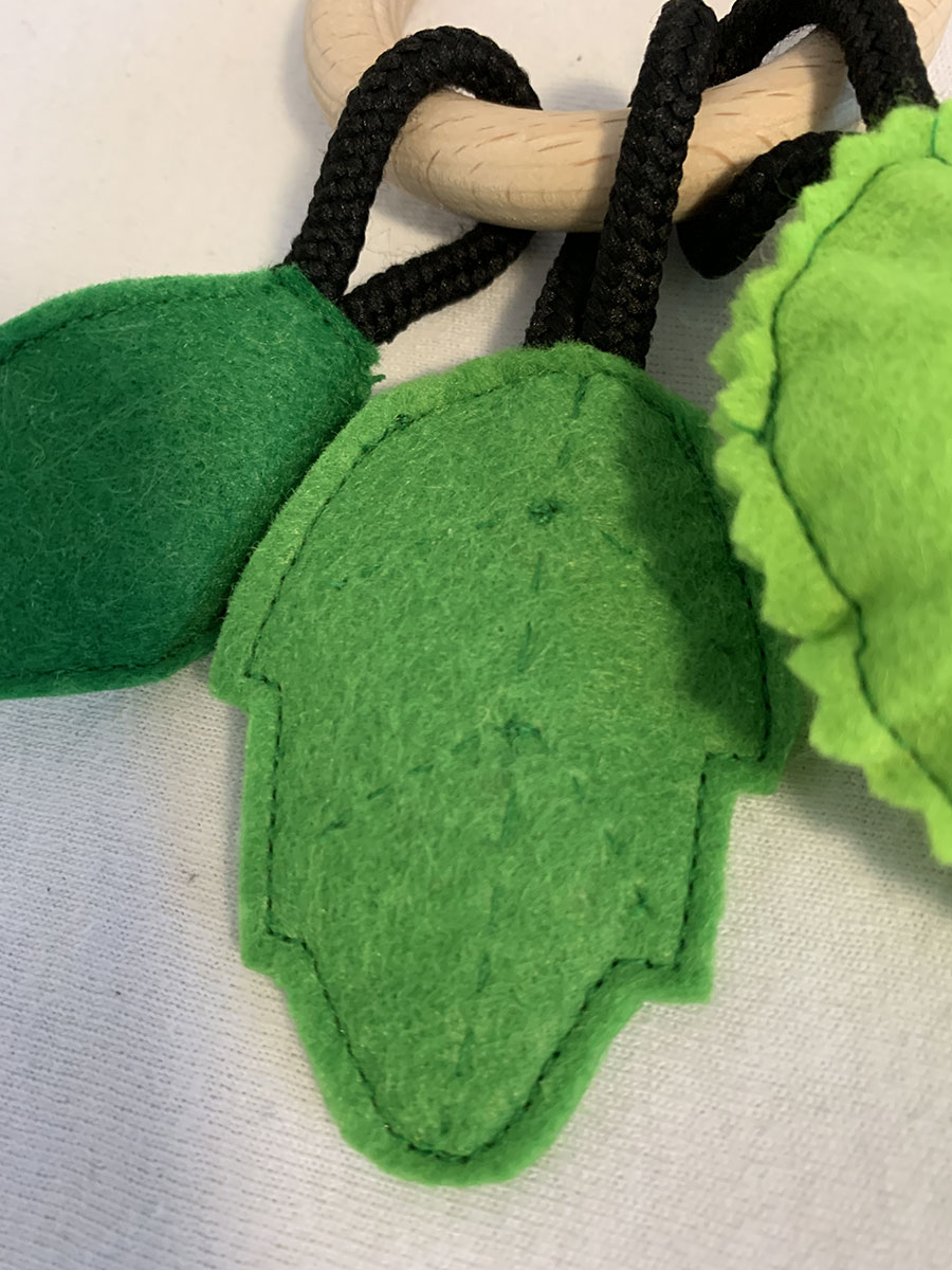 Was het blaadje onder de kraan met de hand of neem hem af met een vochtige doek. De houten ring kan schoongemaakt worden met een vochtige doek. Doe de rammelaar NIET in de wasmachine en NIET in de droger. Laat het aan de lucht drogen.