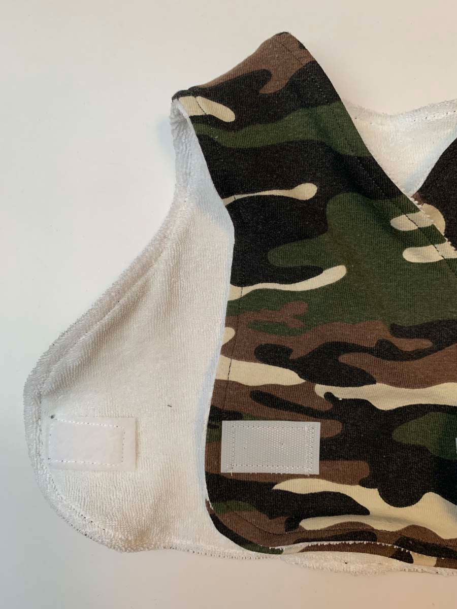 Het overslaghemdje is gemaakt van zachte tricot stof met camouflageprint aan de buitenkant en een effen witte tricot badstof aan de buitenkant. Hij wordt vastgezet met zacht klittenband.
