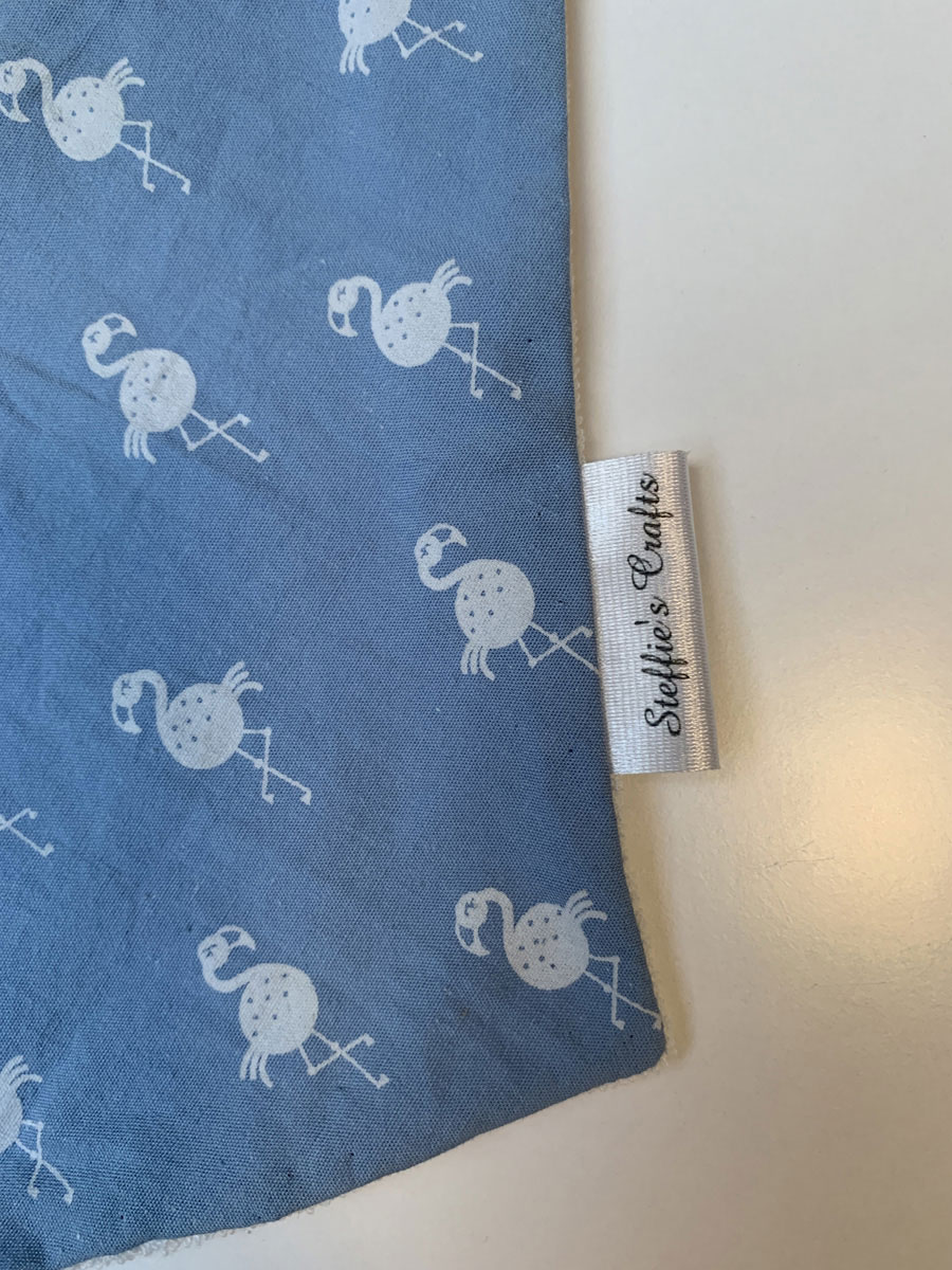 Een kleine, hippe slabber met blauwe flamingoprint die veel vocht opneemt.