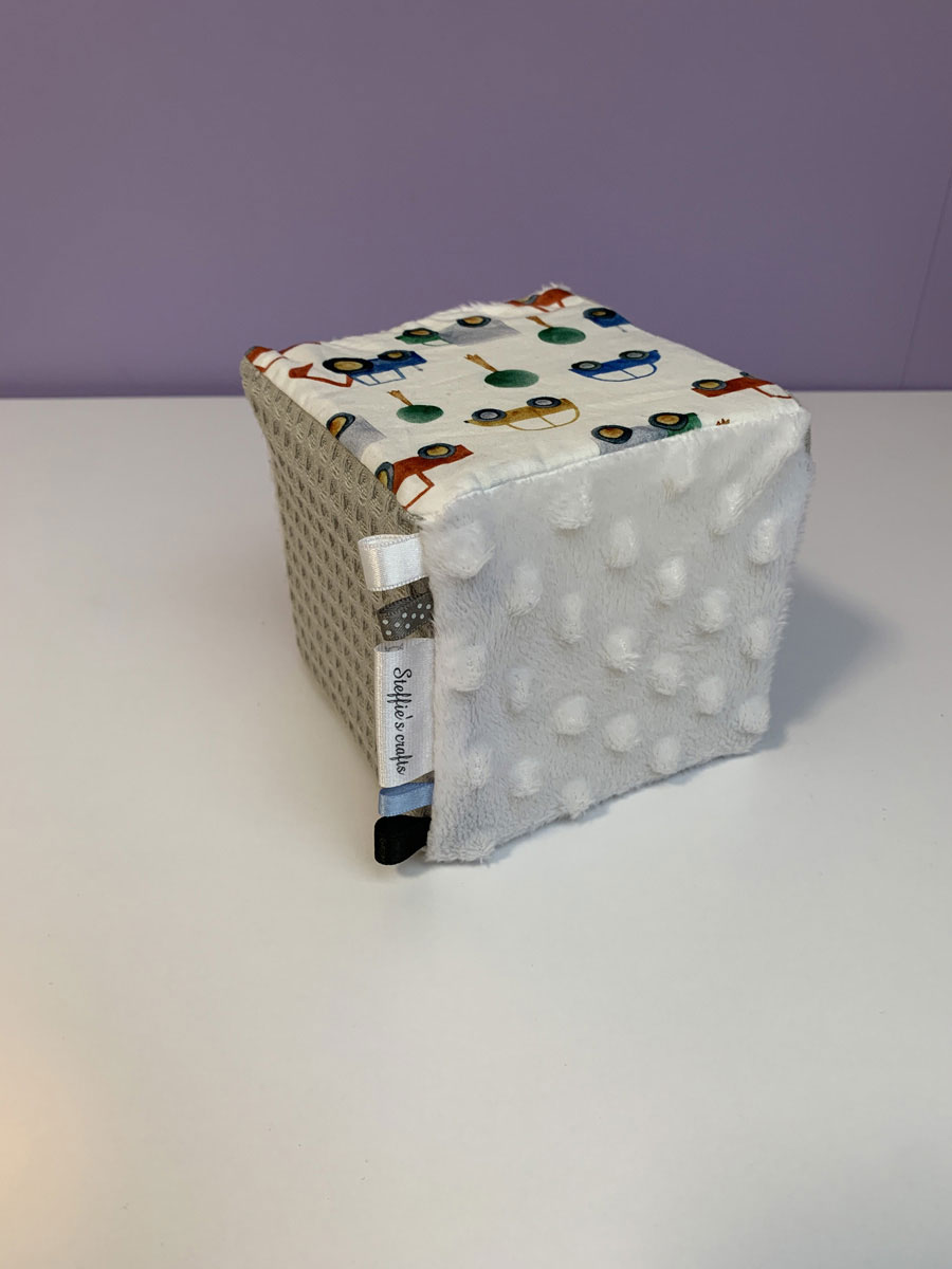 Een leuke speelkubus voor baby’s in de kleuren wit, licht grijs en een gekleurde autoprint. Deze leuke speelkubus is gemaakt van  verschillende stoffen waaronder katoen, Minkey fleece en badstof. De kubus op de foto bevat een vulling van schuimrubber. In de vulling zit een rammelbal en op de kubus zitten 4 gekleurde labels.